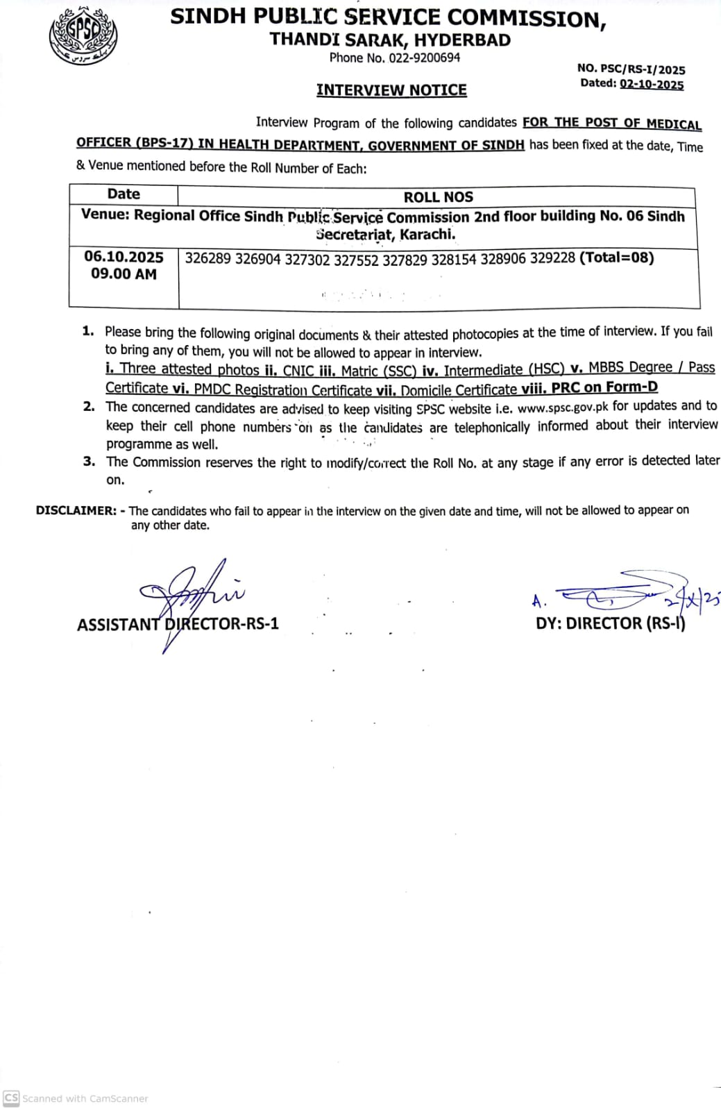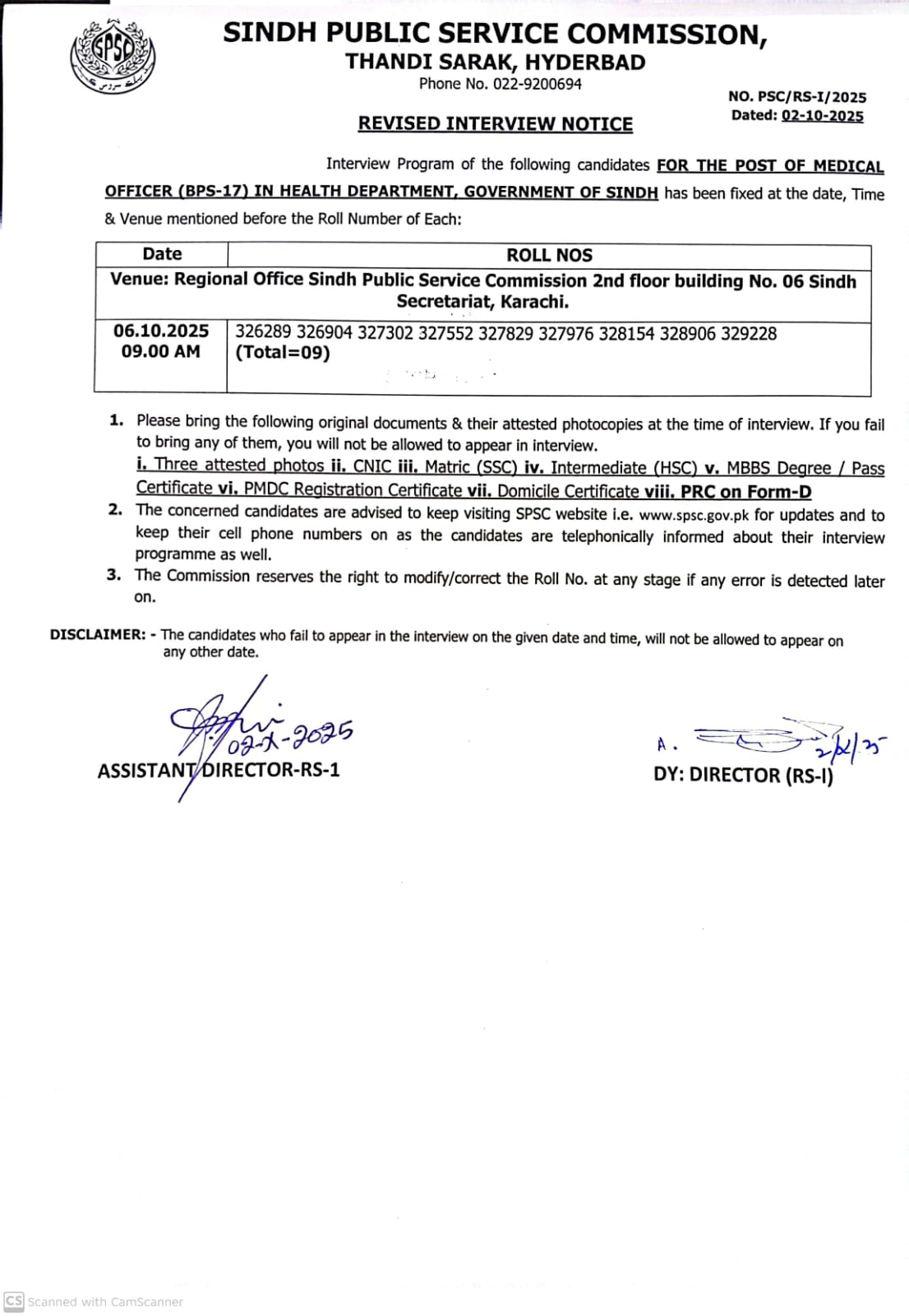 DATEWISE ROLL NUMBERS OF CANDIDATES TO BE INTERVIEWED