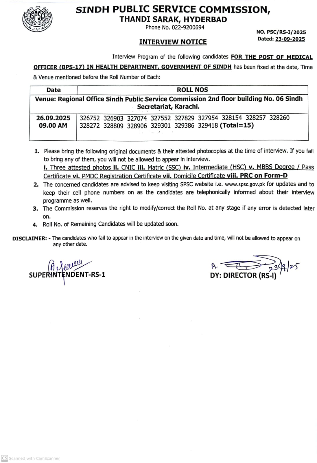POSTPONED Medical Officer BPS-17 (09.09.25 to 11.09.25)